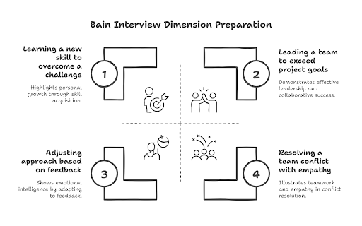 Story variety: Ensure you have at least 8-10 different personal stories ready, as Bain’s structured behavioral interview will require multiple examples.