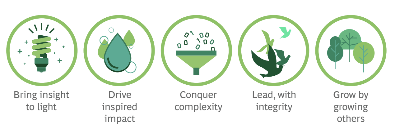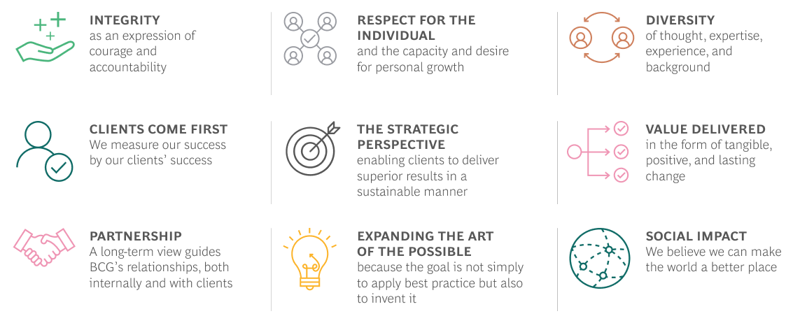 BCG values are the foundation of their culture, ingrained in everything they do and central to the firm’s ability to lead with integrity as a global consulting firm. Here are the values: Integrity, Respect for the Individual, Diversity, Clients Come First, The Strategic Perspective, Value Delivered, Partnership, Expanding the art of the possible and Social Impact.