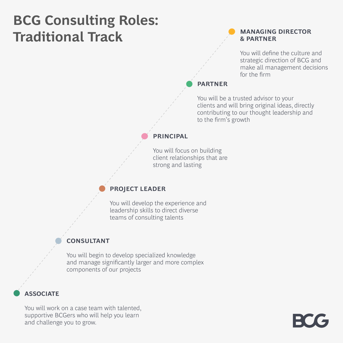 The firm’s overall goal is to provide an open and collaborative environment—to break down barriers between cohorts, levels of seniority, and consultant/non-consultant staff. And they are successful. Friendships between principals and associates, or partners and consultants, are not uncommon. A key contributor to a long-lasting and fulfilling career as a BCG consultant is the support network provided by colleagues.