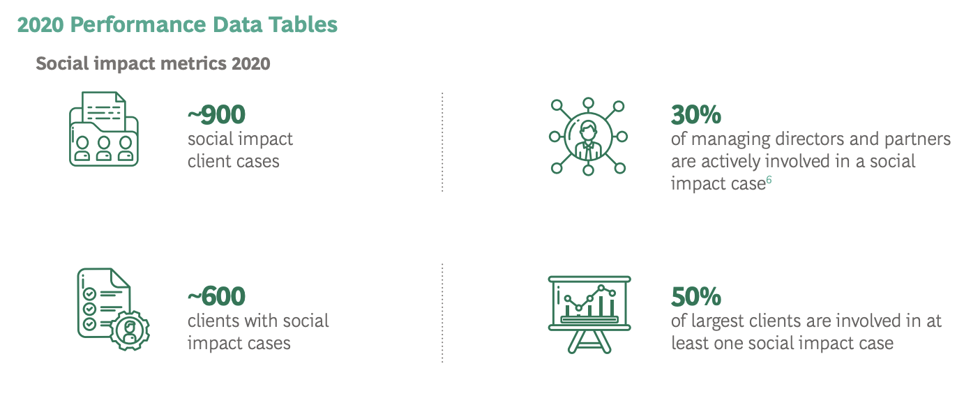 In 2020, BCG delivered approximately 900 social impact consulting projects with more than 600 organizations, driving progress on critical sustainability issues across the private, public, and social sectors. The firm has continued to incorporate total societal impact—which includes economic, social, and environmental impact—into all aspects of their operations. And the firm’s fastest-growing practise was social impact.